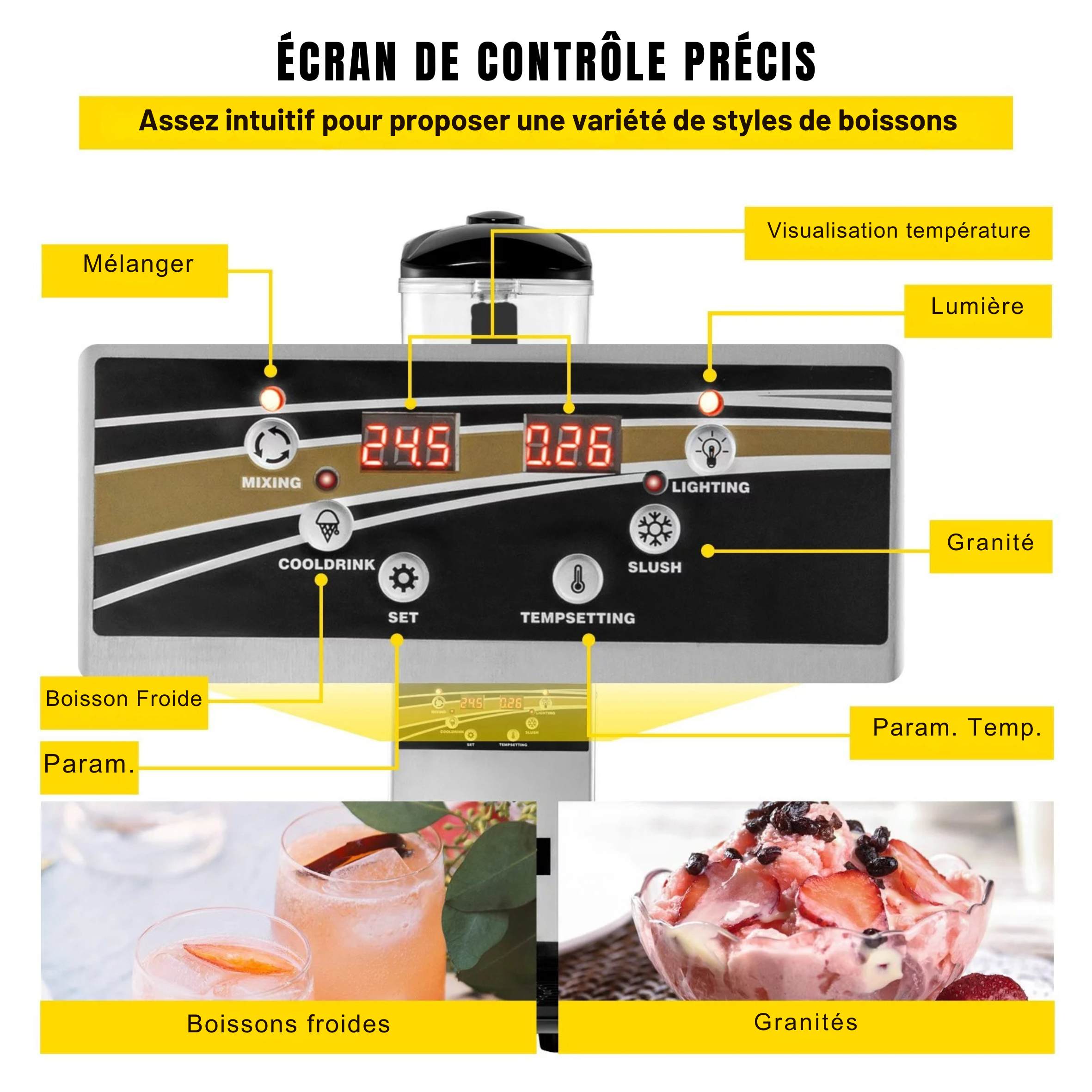 L’interface digitale intuitive permet un contrôle précis des paramètres, tandis que l’agitateur rotatif assure une consistance homogène de vos granités. Le robinet grand débit facilite un service rapide, idéal pour les établissements à forte fréquentation.