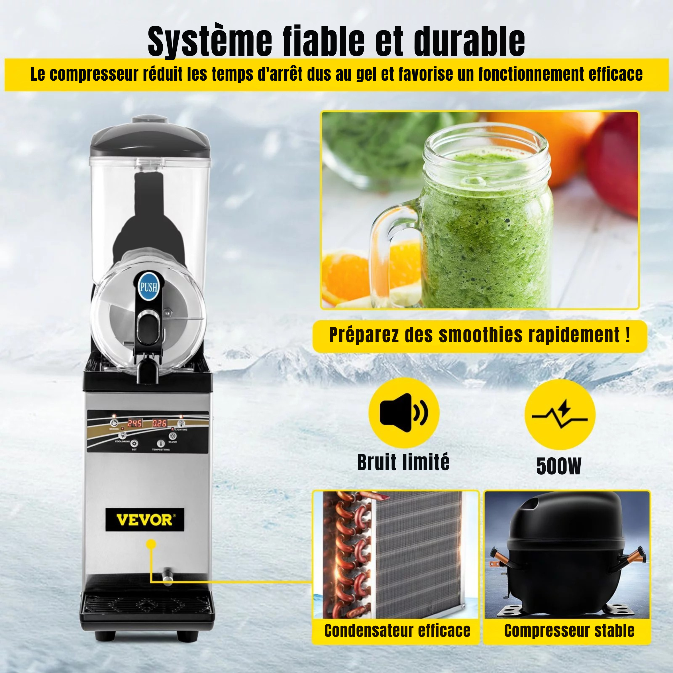 Servir des granités parfaits en pleine période estivale devient un jeu d’enfant avec cette machine professionnelle VEVOR. Conçue pour les établissements à forte activité, elle combine une capacité généreuse de 15L avec un système de réfrigération rapide de 500W pour répondre aux pics d’affluence sans stress.